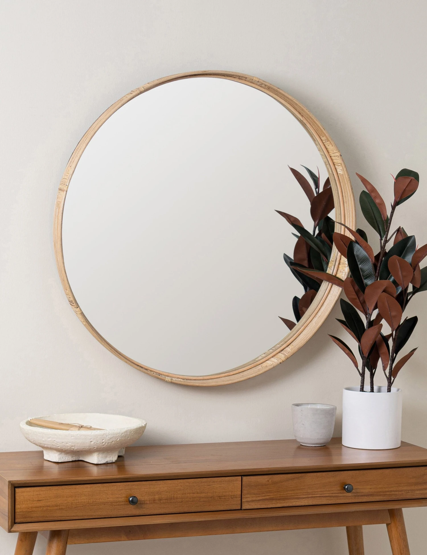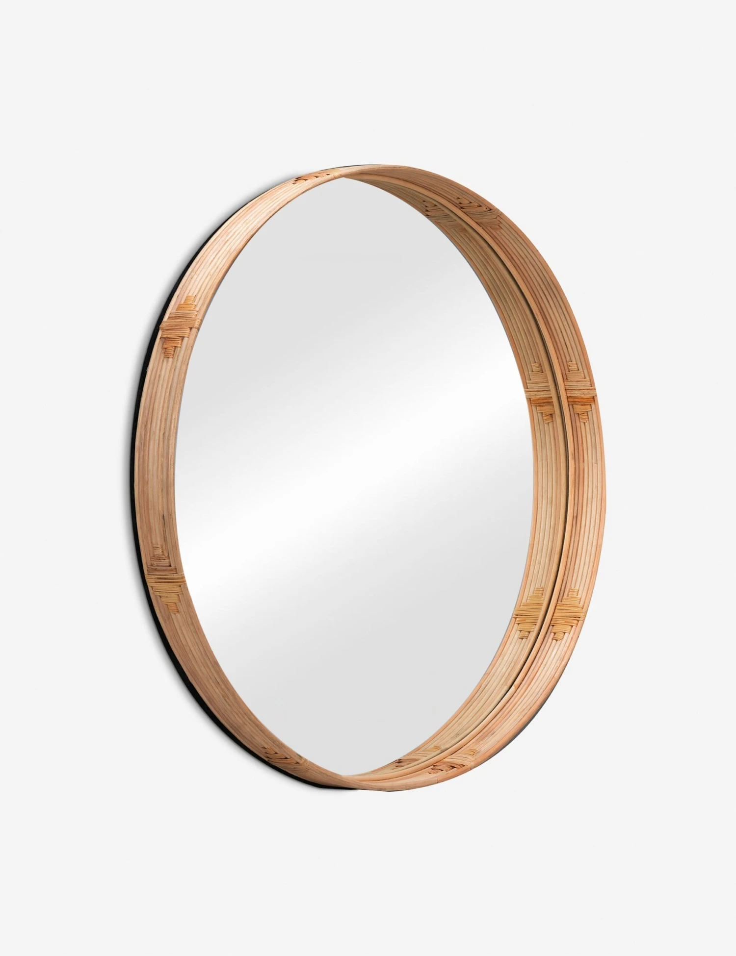 This round mirror may appear simple from a distance, but get closer and you’ll see the small geometric details woven into the rattan frame. We love the subtle Southwestern influence of this wall-mounted mirror!