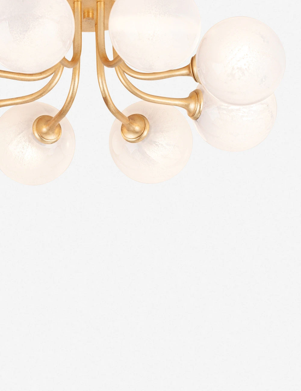 A frosted orb and gold leaf finish offer a touch of brilliance to the graceful lines of this overhead light fixture. The semi-flush mount design is ideal for a grand statement in a luxe apartment or enclosed dining space.