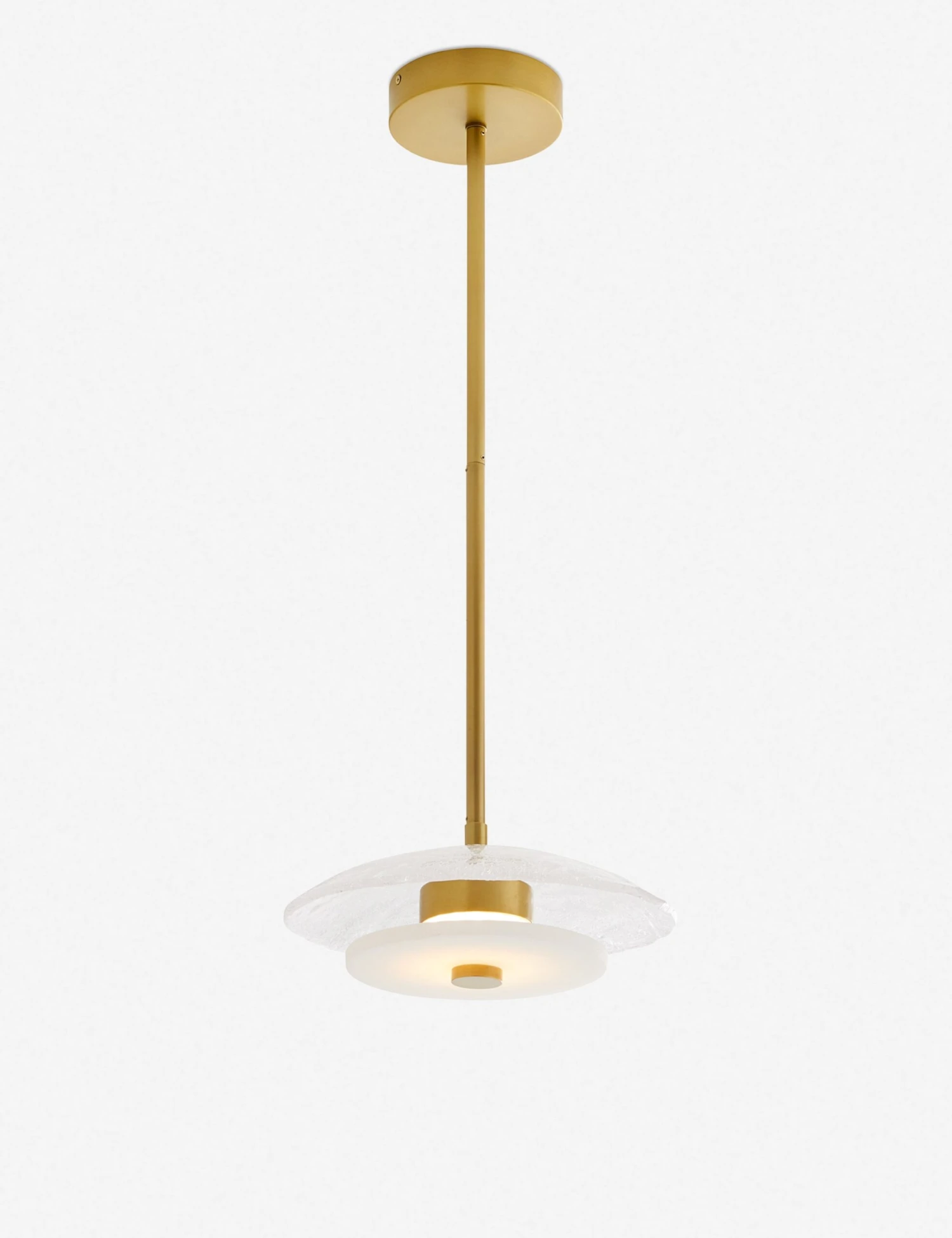 Clean lines and a dashing mix of materials fashion this pendant for signature appeal. The seeded slump glass shade floats over an alabaster disc on an antique brass finished pipe to offer ample light with a dramatic silhouette. Try styling in multiples for feature lighting in your dining room or lounge.