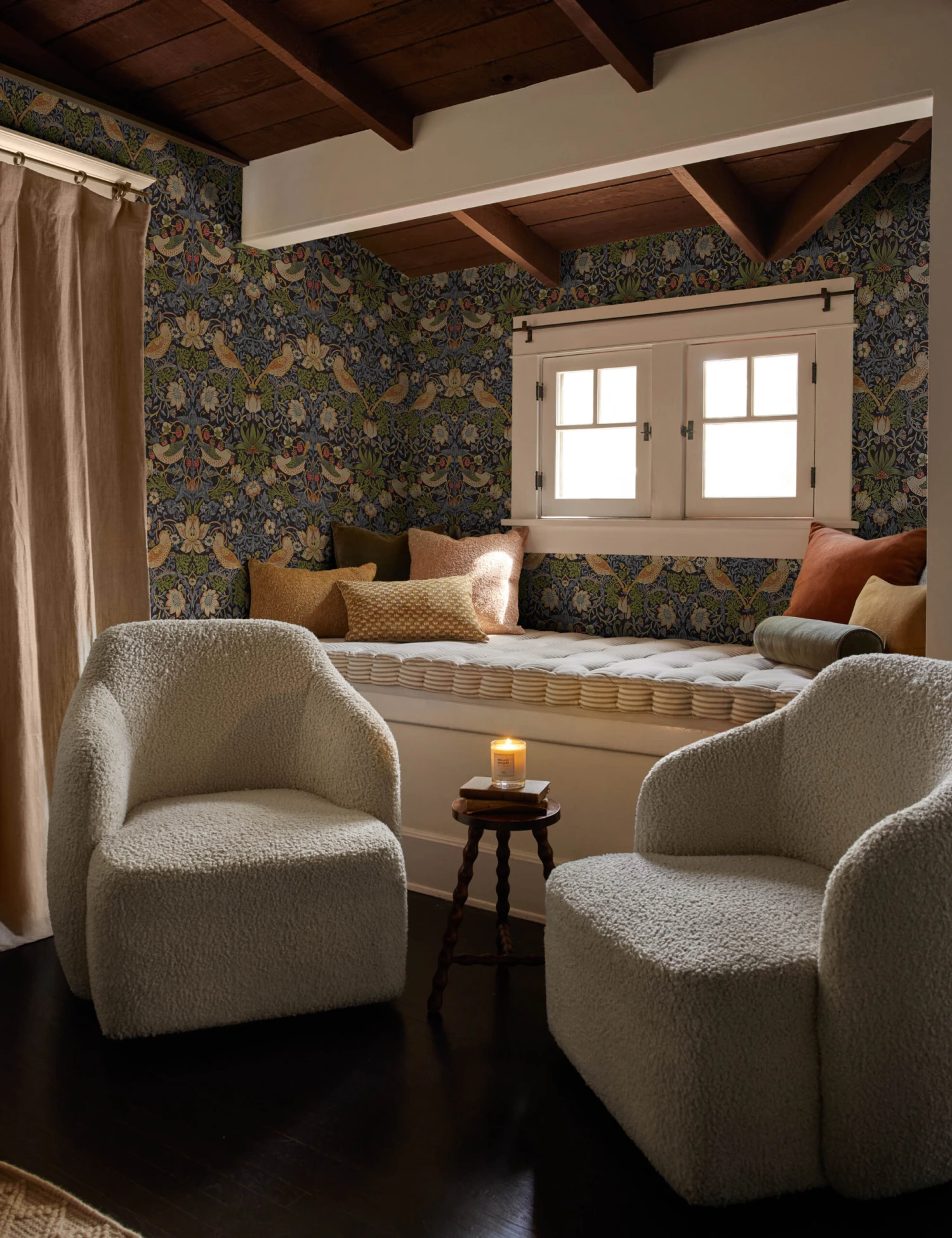 This wallpaper exquisitely showcases one of Morris & Co.’s most sought-after patterns, “Strawberry Thief”, influenced by the thrush’s that would fly in and steal the fruit right out of famed Arts & Crafts textile designer William Morris’s kitchen garden at his Kelmscott Manor home in Oxfordshire England. Its ornate quality in a multicolored hue updates your walls with bold sophistication.
