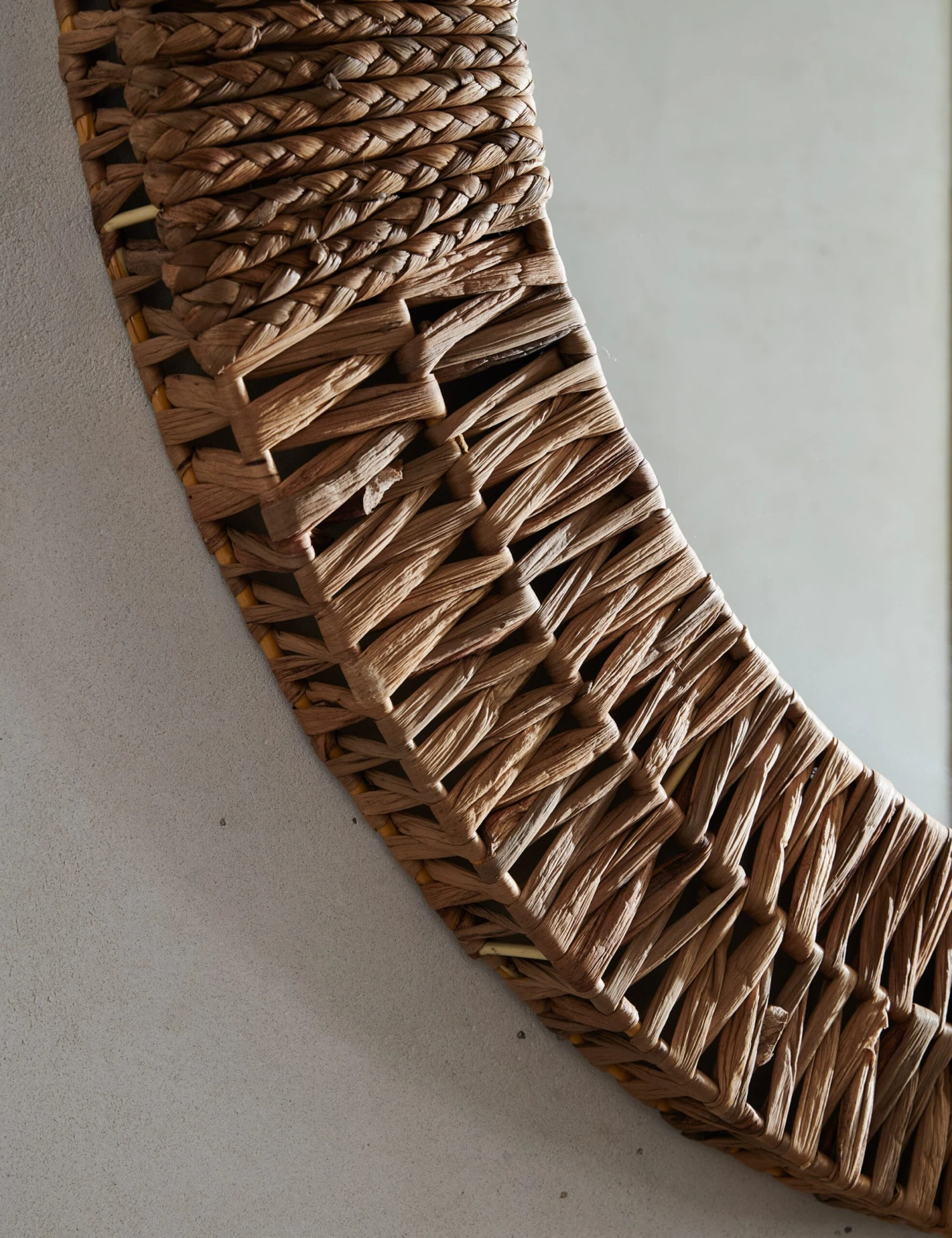 Featuring a circular frame with an open-weave design, this round decorative mirror is the definition of organic appeal. The natural fibers of this wall mirror add instant texture to any room, with versatile styling options as a standalone piece, or hung above a console or dresser.