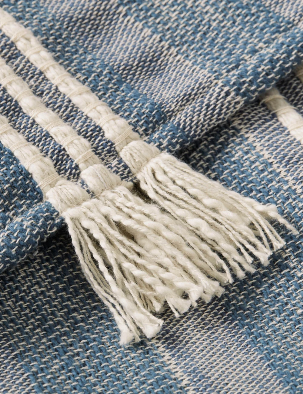 Amber Lewis brings her California cool style to Loloi’s quality textiles in this striking line of throw blankets. In a rich blue palette, this Sur throw offers a coastal look and features a refined striped design, soft cotton touch, and tassel accents.