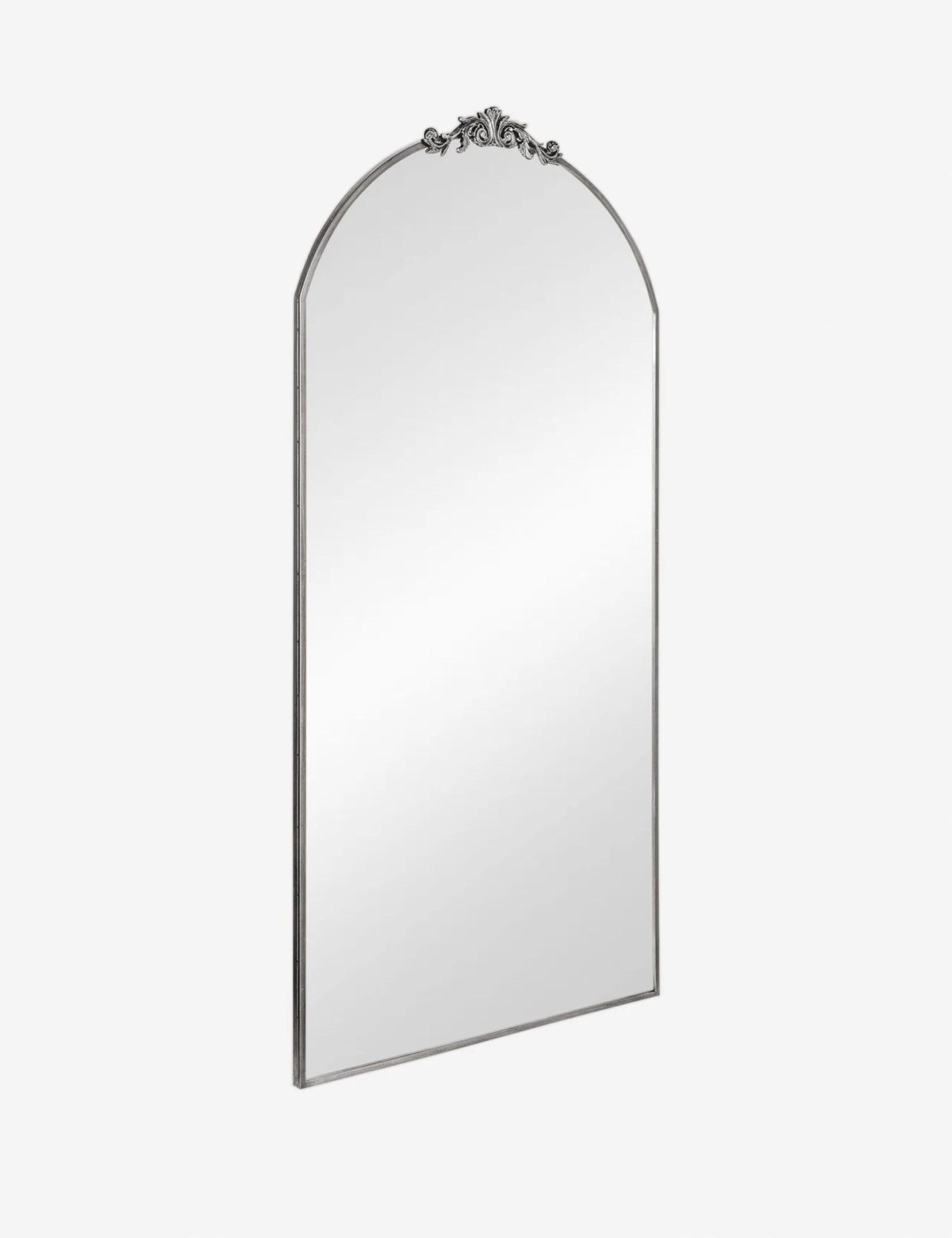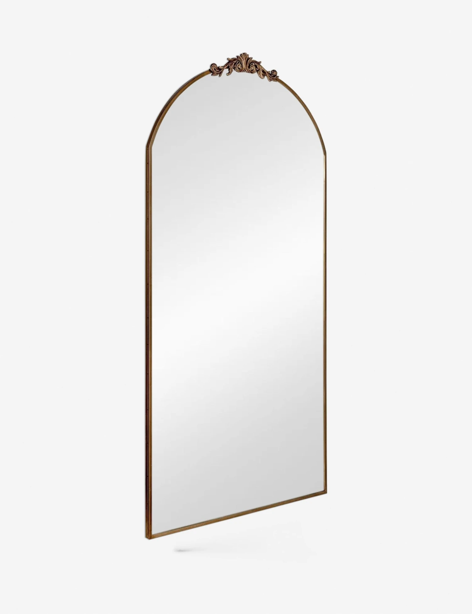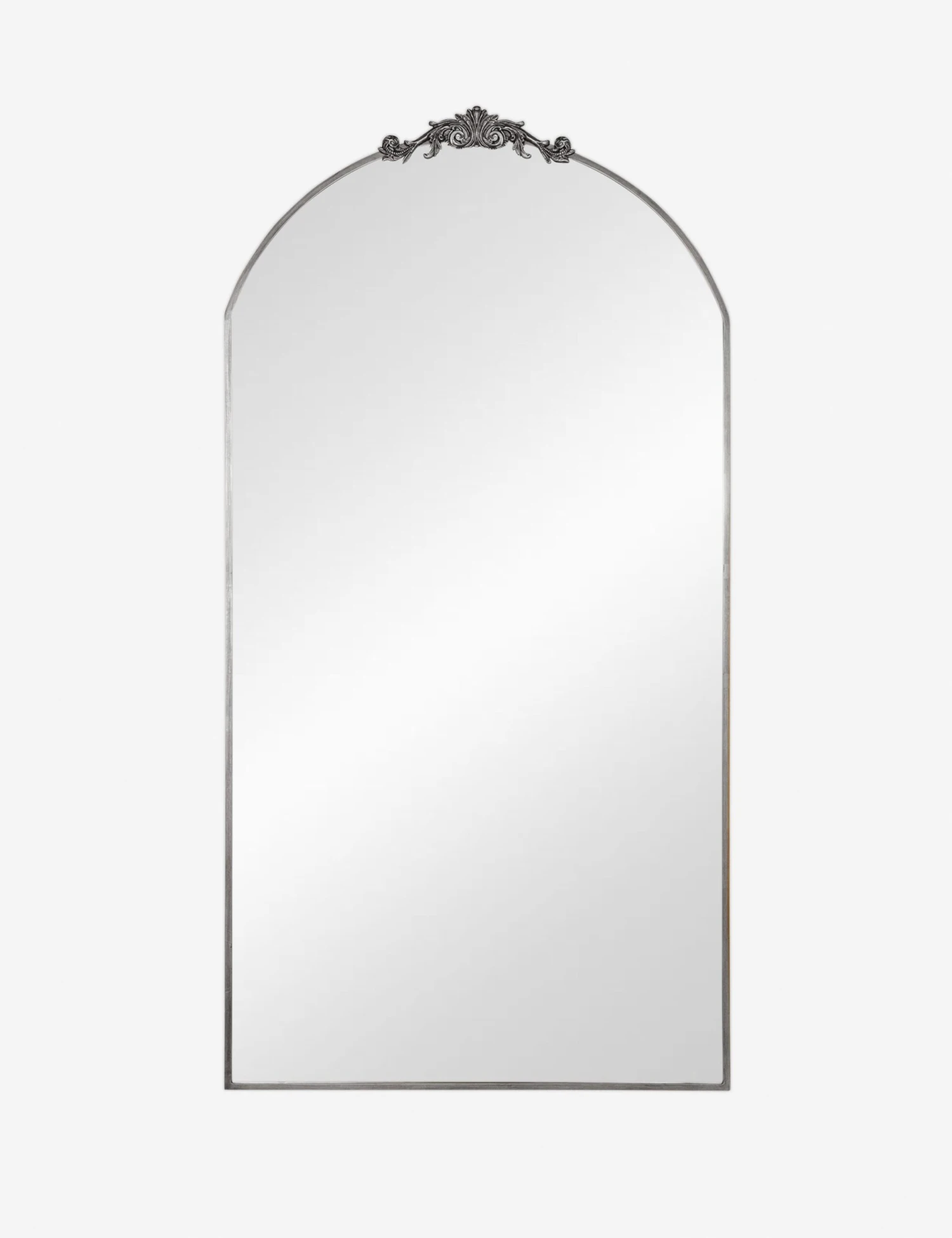 A large ornate floor mirror with impressive style. The Tulca curved standing mirror features a flat bottom edge and traditional scroll detailing at the apex of the metal frame, making it the perfect vintage-inspired full-length mirror for entryways, dining rooms, or bedrooms alike.