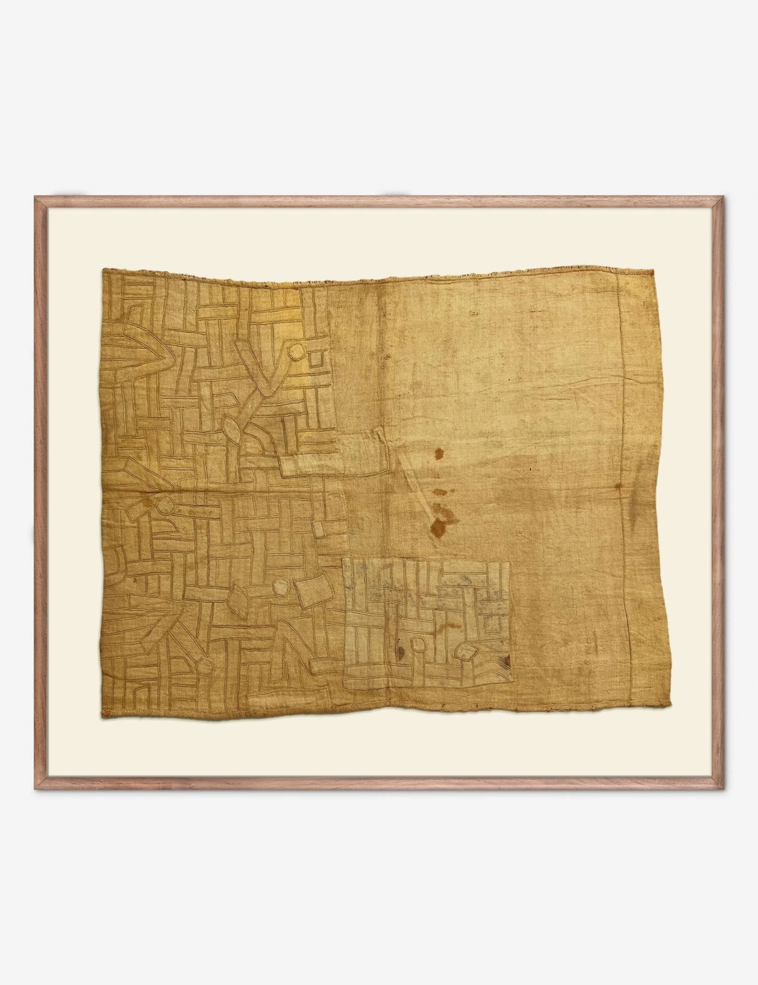 Bring a singular touch to your wall decor with this one-of-a-kind cloth from Congo. The word Kuba means lighting and refers to the blades once used by Kuba warriors. Each cloth is handcrafted using traditional techniques—first woven on a small loom, then embroidered with their tactile design—before being floated in a walnut frame for a truly unique piece of textile wall art.